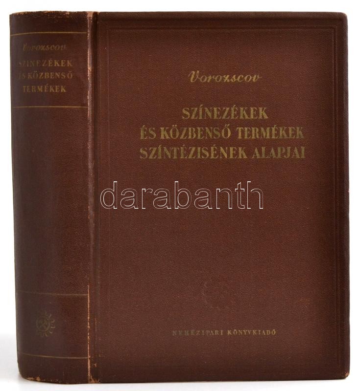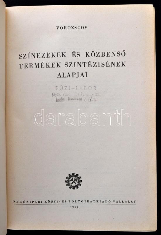 Vorozscov: Színezékek és közbenső termékek szintézisének alapjai. Bp.,1952, Nehézipari. Kiadói kissé kopott aranyozott egészvászon-kötés. Megjelent 1000 példányban.