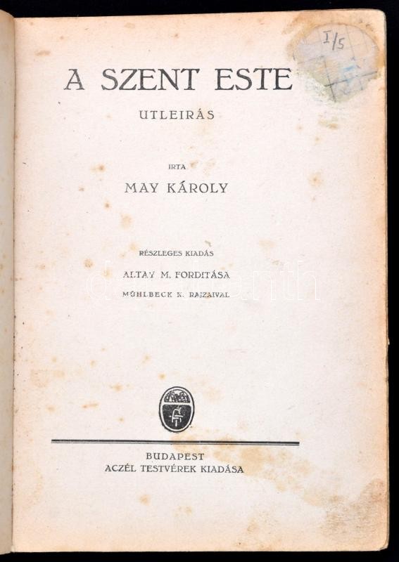 May Károly: A szent este. Útleírás. Fordította: Altay M(argit.) Mühlbe... https://www.darabanth.com/en/350-Online-auction/350.0/Books/Books-Other-rarities~50/May-Karoly-A-szent-este-Utleiras-Forditotta-Altay-Margit-Muhlbeck-Karoly-Bp-1936-A~II1975564