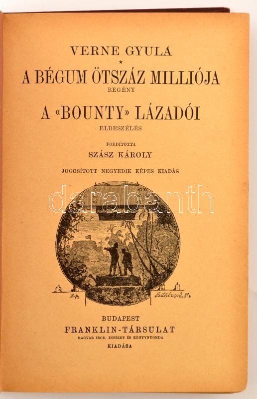 Verne Gyula: A bégum ötszáz milliója. A Bounty lázadói. Fordította Szász Károly. Bp., é.n. Franklin. Negyedik, képes kiadás. Kiadói illusztrált egészvászon-kötés, kopott borítóval.