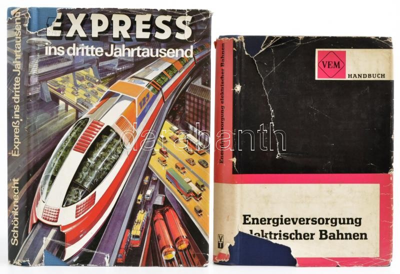 Rolf Schönknecht: Express ins dritte Jahrtausend. Leipzig-Jena-Berlin,1986,Urania. Német nyelven. Kiadói egészvászon-kötés, kiadói szakadt papír védőborítóban.+VEM-Handbuch. Energieversorgung elektrischer Bahnen. Berlin, 1975, VEB. Német nyelven. Kiadói egészvászon-kötés, kiadói papír védőborítóban.