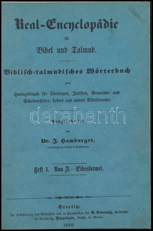 Description: Real-Encyclopädie für Bibel und Talmud. I. Von A-Eidesformel. Szerk.: Dr. Jacob Hamburger. Strelitz, 1866, Szerzői kiadás, 278 p. Német nyelven. Átkötött félvászon-kötés, az eredeti papírborítókat bekötötték, két kijáró lappal.