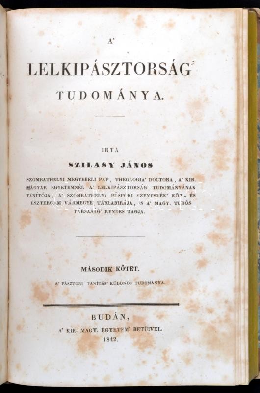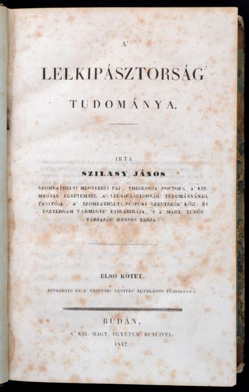 Description: Szilasy János: A lelkipásztorság tudománya I-II. kötet. (Egy kötetben.) Buda, 1812, Kir. M. Egyetem Betűivel, XIII+371+XII+407 p. Korabeli félbőr-kötésben, kopott borítóval, foltos lapokkal.
