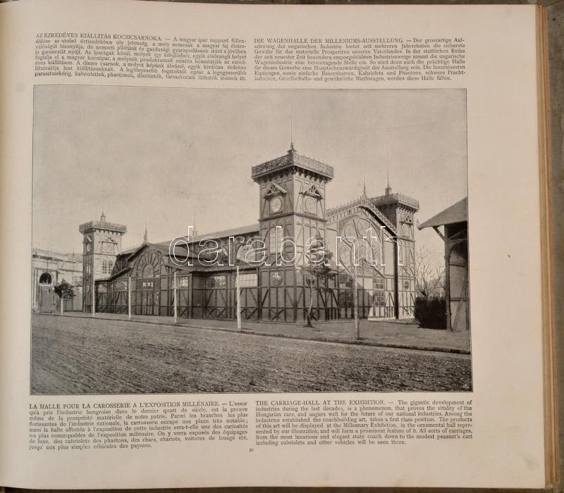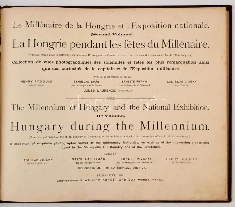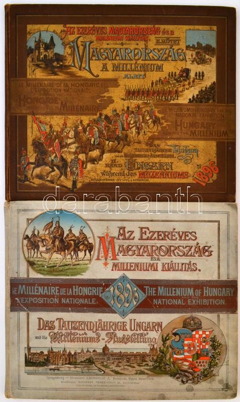Az ezeréves Magyarország és a Milléniumi Kiállítás. I. és II. kötet. Magyarország legszebb tájainak, városainak és műkincseinek valamint a kiállítás nevezetességeinek fényképgyűjteménye. Részben Vágó Bertalan a M.Á.V. fényképésze. A kereskedelemügyi m. kir. ministerium pártfogása mellett, a m. kir. államvasutak és az ezredéves országos kiállítás igazgatóságának megbízásából és közreműködésével kiadja Laurencic Gyula. Szerkesztik: Piványi Ernő a magyar és német, Timár Szaniszló a magyar, Palóczy Lipót a német, Fouquau Henrik a francia, Steiner Gyula és Vidéky László az angol szöveget. [Magyar, német, angol és francia nyelven.] Bp., 1896. Kunossy Vilmos és Fia, 210+2, 96 p. Mind a két kötet rendkívül gazdag képanyaggal illusztrált. Kiadói festett, aranyozott, dombornyomásos kiadói haránt alakú egészvászon-kötésben, kopott, kissé foltos borítóval, az I. kötet gerincén kis sérüléssel, javított kötéssel, néhány foltos lappal, egy lapon (I. kötet, 65/66.) szakadással.
