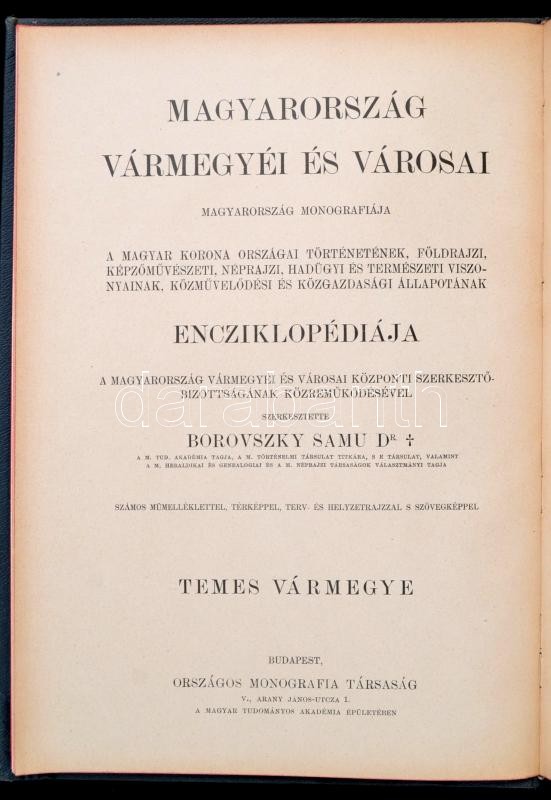 Dr. Borovszky Samu (szerk.): Temes vármegye és Temesvár. Magyarország vármegyéi és városai. Magyarország monográfiája. Bp.,é.n., Országos Monográfia Társaság, 1 t.+2+VII-X+463+6+V+294 p. Rendkívül gazdag egészoldalas és szövegközti képanyaggal, és egy térképpel illusztrált. Kiadói aranyozott, festett, dombornyomott, illusztrált egészvászon-kötés, Gottermayer N.-féle kötés, színezett lapszélekkel, kissé kopott borítóval, a gerincen kis sérüléssel.