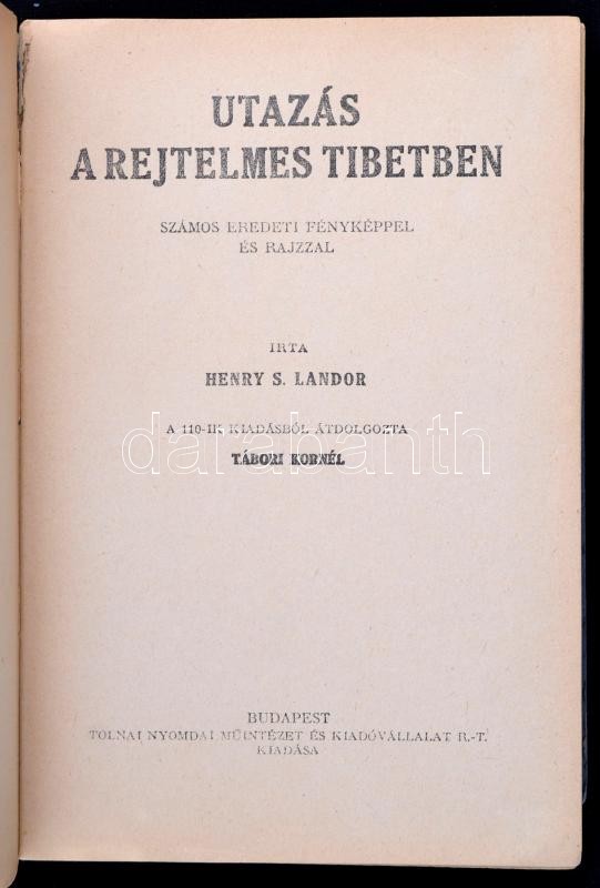 Henry S. Landor: Utazás a rejtelmes Tibetben. Átdolgozta Tábori Kornél. Bp., é.n., Tolnai. Kiadói illusztrált kartonált papírkötés, kissé foltos, kissé kopott borítóval, a borító és a gerinc alsó sarkain kis sérüléssel, hiánnyal