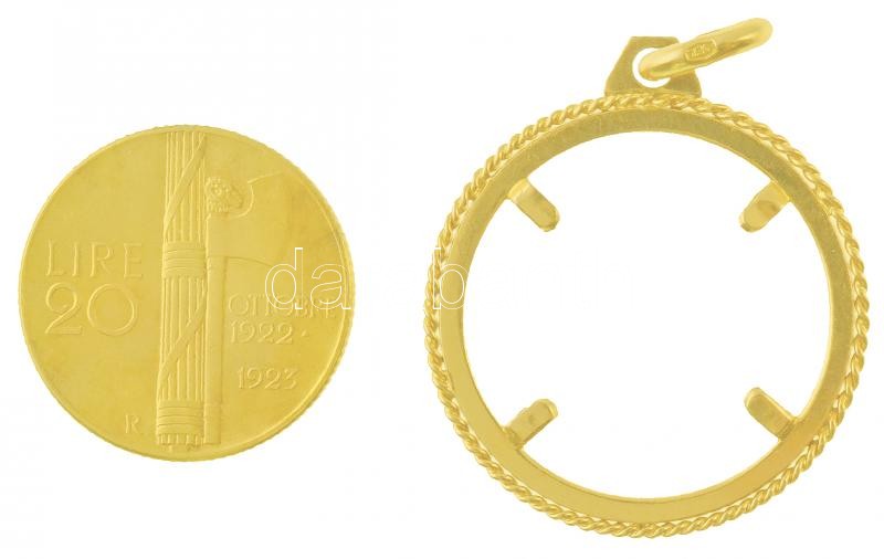 Olaszország 1923R 20L Au "Fasiszta kormány 1. évfordulója" jelzett Au, Hamisítvány!, kerettel (a keret 0.750; az érme 0.900; Érme: 6,49g, keret:3,33g) T:1- Italy 1923R 20 Lire Au "1st Anniversary of Fascist Government" with hallmarked Au frame, Fake coin! (the frame 0.750; the coin 0.900; Coin: 6,49g, Frame 3,33g) C:AU Krause KM#64