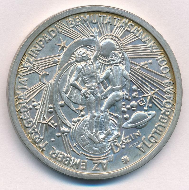 Description: Garamkeszi János (1936-) 1983. "MÉE XIII. Vándorgyűlése - Salgótarján / Madách Imre - Az ember tragédiája" Ag emlékérem (35,08g/0.640/42,5mm) kék műbőr tokban T:1 kis patina