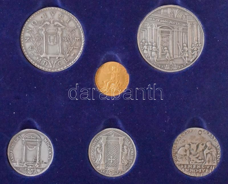 Olasz Államok / Pápai Állam 1525. 1/4D Ag "VII. Kelemen" (9,6g/0.835) + 1650. 1P Ag "X. Ince" (32,31g/0.835) + 1675. 1T Ag (10,05g/0.835) + 1P Ag "X. Kelemen" (32,22g/0.835) + 1725. 1T Ag "XIII. Benedek" (9,6g/0.835) + 1825. 2Z Au "XII. Leó" (7,44g/0.917) Mind a hat érme hivatalos utánveret, melyeket a Banca di Roma adott ki 1999-ben, eredeti dísztokban, tanúsítványokkal. T:1,1- / Italian States / Papal States 1525. 1/4 Ducato Ag "Clement VII" (9,6g/0.835) + 1650. 1 Piastra Ag "Innocent X" (32,31g/0.835) + 1675. 1 Testone Ag (10,05g/0.835) + 1 Piastra Ag "Clement X" (32,22g/0.835) + 1725. 1 Testone Ag "Benedict XIII" (9,6g/0.835) + 1825. 2 Zecchini Au "Leo XII" (7,44g/0.917) All six coins are modern restrikes issued by Banca di Roma in 1999, in original case with certificates. C:UNC,AU