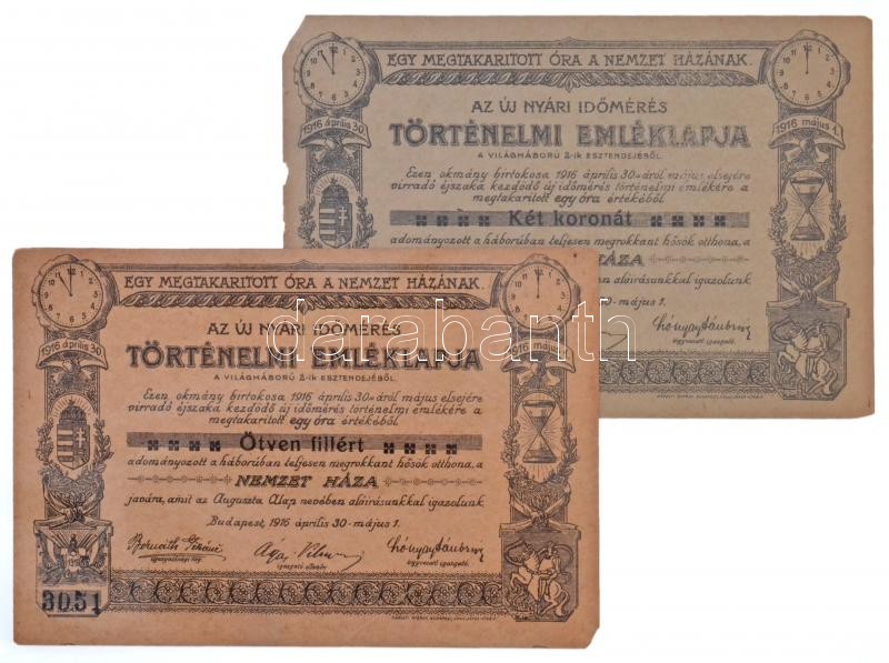 Description: 1916. 50f + 2K "Az új nyári időmérés történelmi emléklapja adomány a Nemzet Háza javára" mindkettő sorszámozott T:III szakadás,hiányzó sarok /