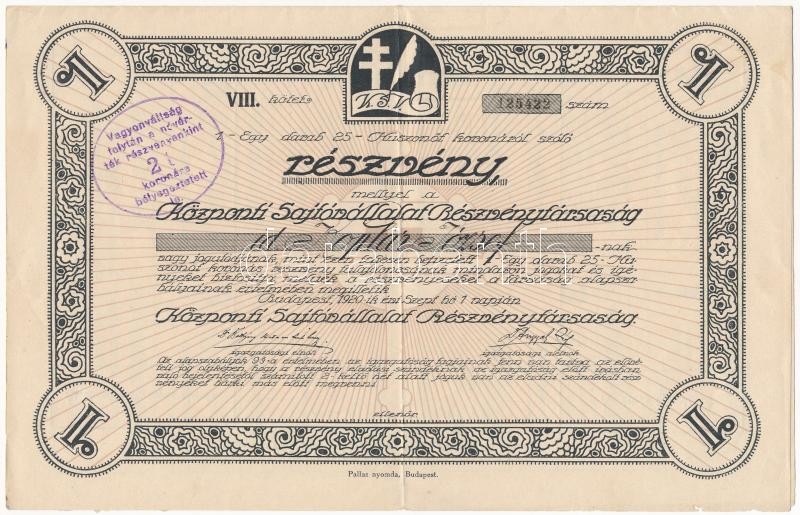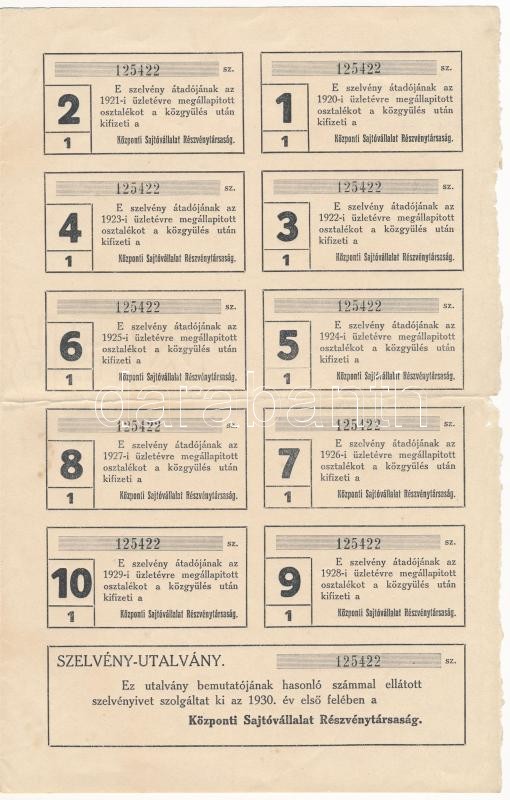 https://www.darabanth.com/en/350-Online-auction/350.0/Numismatics/Shares-and-Tickets~1000005/Budapest-1920-Kozponti-Sajtovallalat-Reszvenytarsasag-reszvenye-25K-rol-felulbelyeg~II1991335