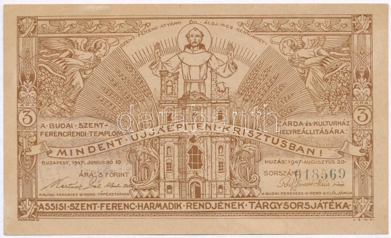 https://www.darabanth.com/en/350-Online-auction/350.0/Numismatics/Shares-and-Tickets~1000005/Budapest-1947-Assisi-Szent-Ferenc-Harmadik-Rendjenek-Targysorsjateka-sorsjegy-ara-3Ft-TI-~II1993726