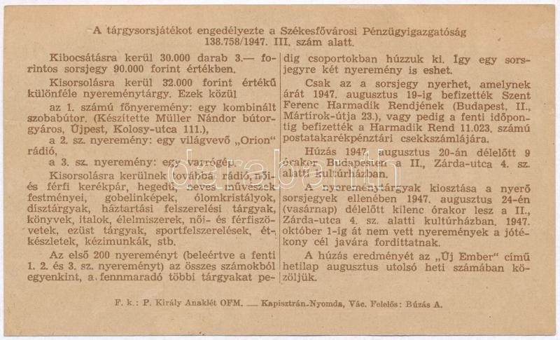 Budapest 1947. "Assisi Szent Ferenc Harmadik Rendjének Tárgysorsj...
