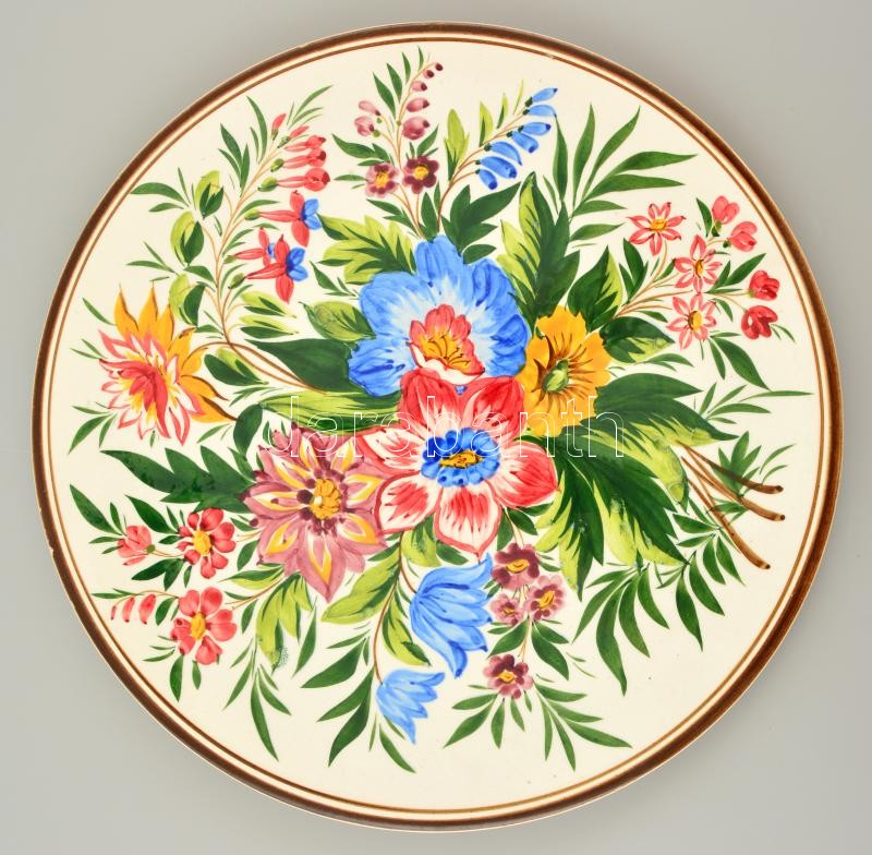 Apátfalvi kerámia fali tál, kézzel festett, jelzett, kis lepattanással, d: 32 cm