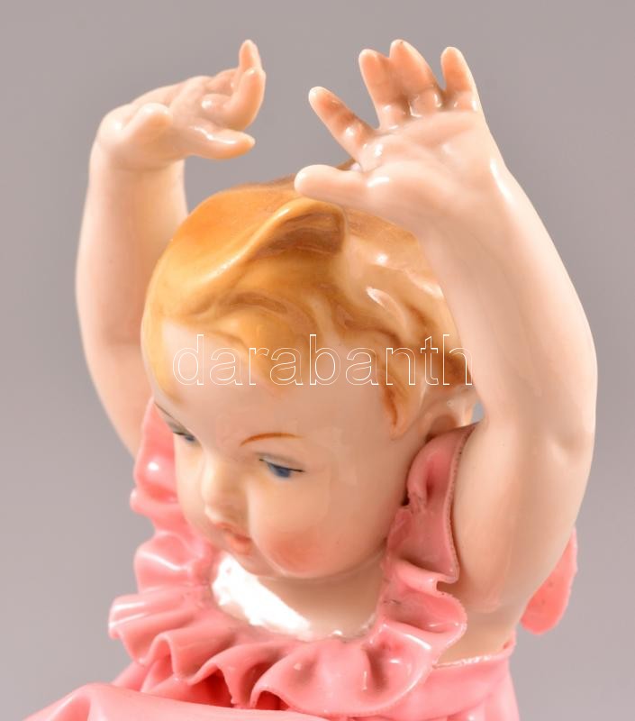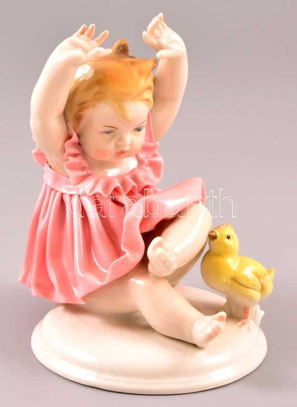Ens kislány csibével, kézzel festett, jelzett, apró máz hibákkal, m:13...