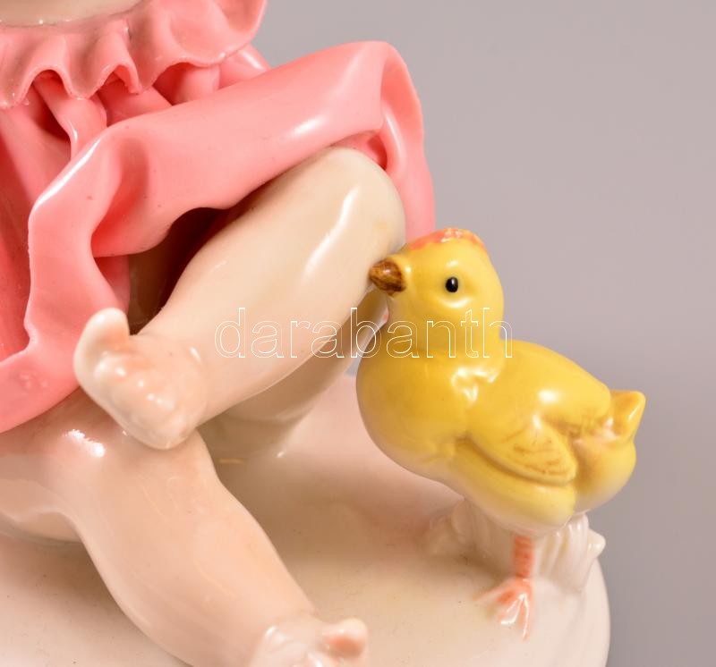 Ens kislány csibével, kézzel festett, jelzett, apró máz hibákkal, m:13 cm