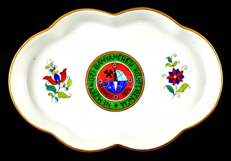 Herendi tálka, "Nemzetközi Bányamérési Konferencia, Budapest 1972" felirattal, kézzel festett, jelzett, apró kopásokkal, 13,5×9 cm