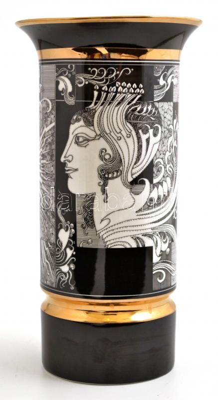 Hollóházi Szász Endre által tervezett mintával díszített porcelán váza, matricás, apró kopásnyomokkal, jelzett, m: 30,5 cm