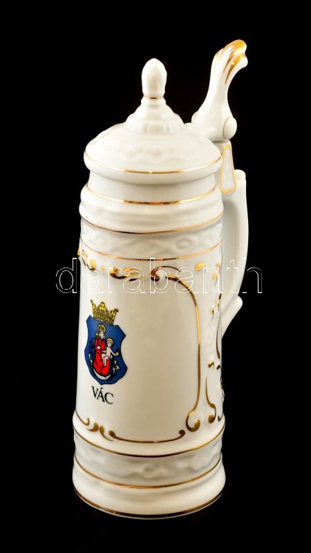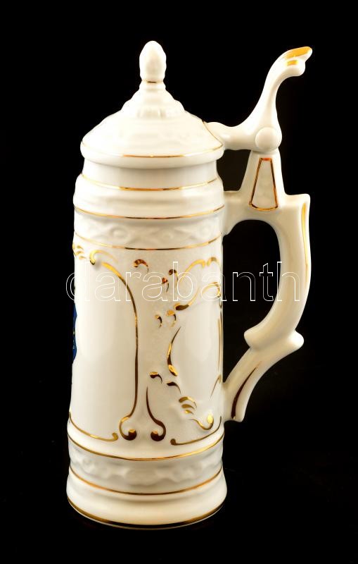 Hollóházi fedeles söröskorsó, aranyozott, matricás, apró kopásnyomokkal, m: 26 cm