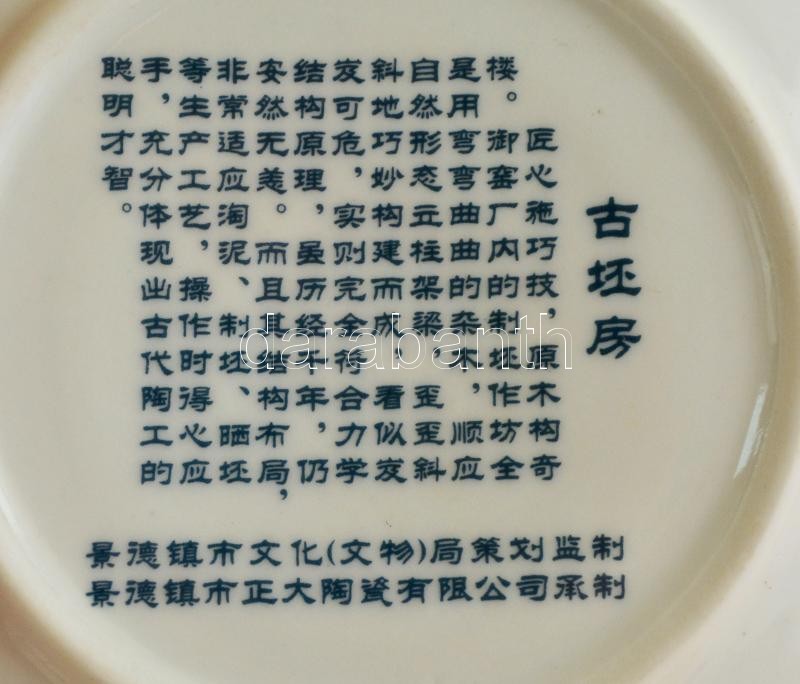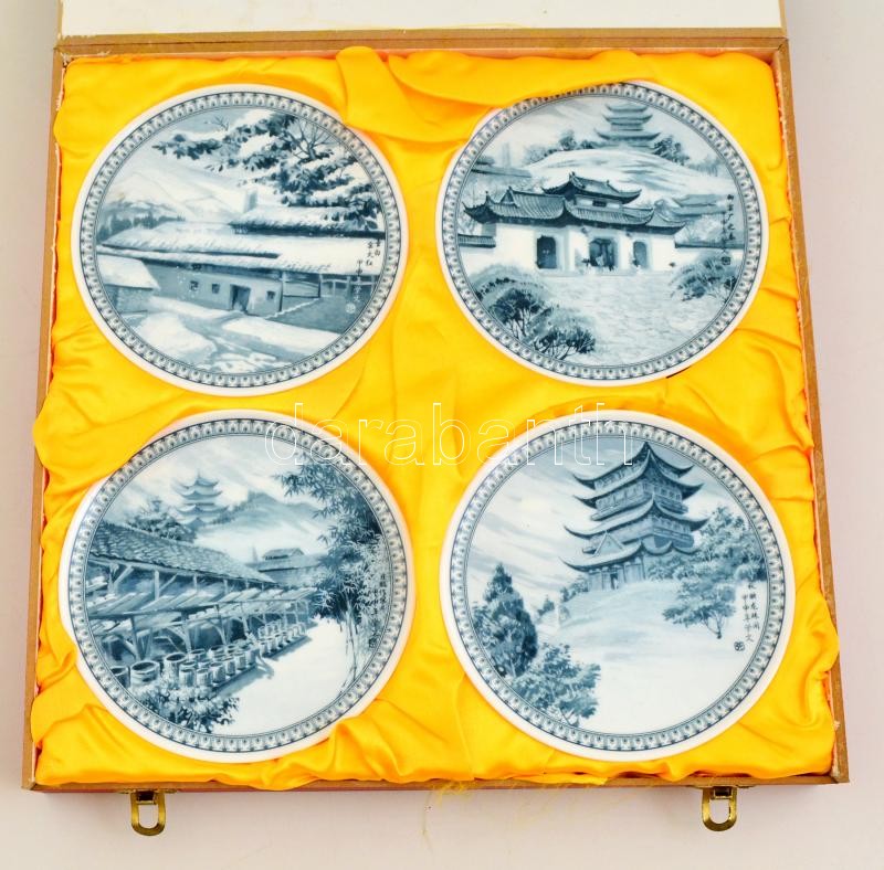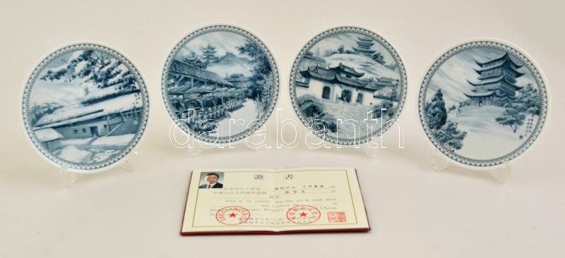 Kínai dísztányér készlet (4 db), levonóképes, jelzett (Jingdezhen), hibátlan, eredeti dobozában, leírással, d:14,5 cm (4×)