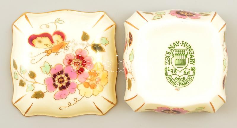Zsolnay virágos bonbonier, kézzel festett, jelzett, apró kopásokkal, 7,5×7,5×4,5 cm