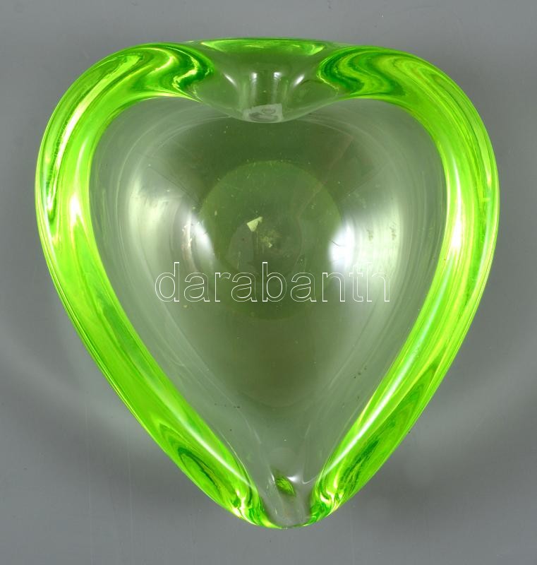 Muránói "uránium" szív tálka, formába fújt, jelzés nélkül, hibátlan, 13×11 cm
