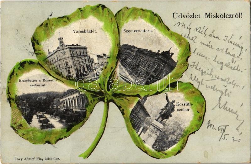 1902 Miskolc, Városház tér, Szemere utca, Erzsébet tér, Kossuth szobor. Lövy József fia kiadása. Lóhere montázs, litho (fa)