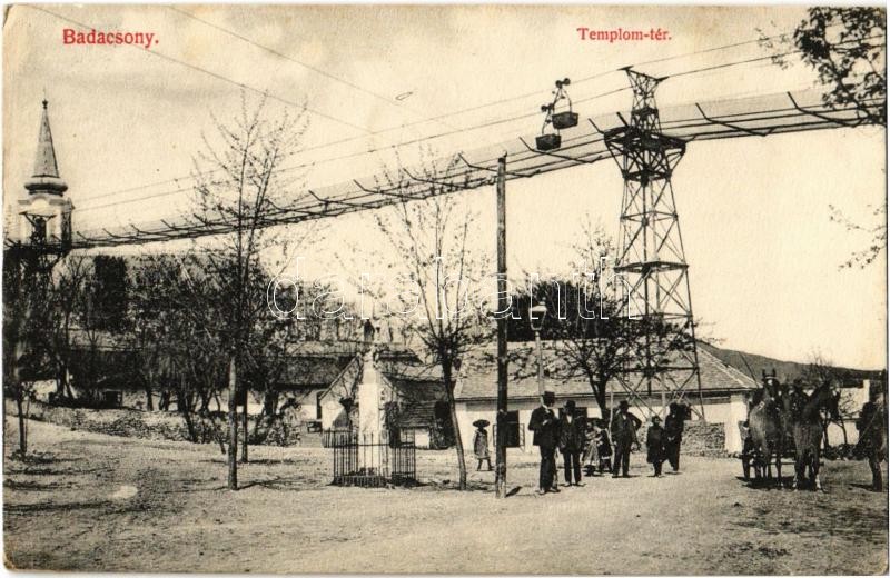 1908 Badacsony, Badacsonytomaj; Templom tér, sodronykötélpálya, ipari drótkötélpálya teherszállításhoz. Kiadja Mérei Ignác 552. sz. (EK)