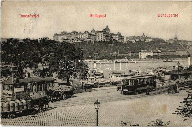1910 Budapest V. pesti rakpart, szemben a királyi várral, villamos, Lá...