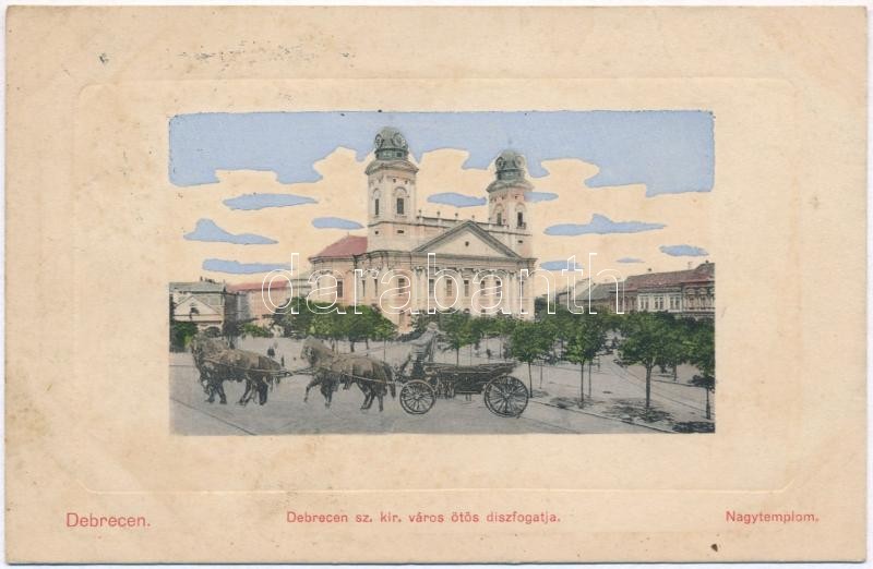 1911 Debrecen, Debreczen sz. kir. város ötös díszfogata, Nagytemplom. Kiadja Harmathy antiquarium (ázott / wet damage)