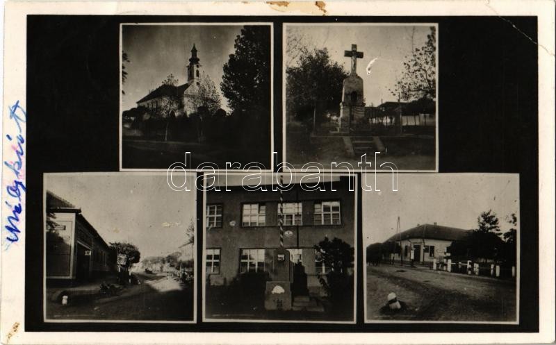 1944 Mélykút, Római katolikus templom, Gyetvai Antal üzlete, kerékpár, Országzászló, utca (ragasztónyom / glue marks)