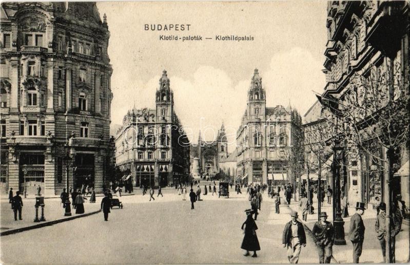 Budapest V. Klotild paloták, háttérben az Erzsébet híd, takarékpénztár,