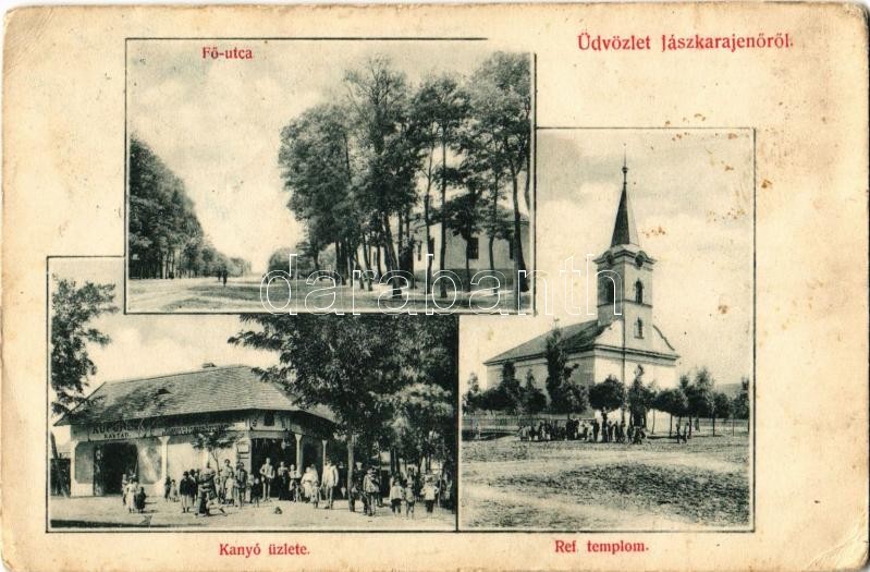 https://www.darabanth.com/en/350-Online-auction/350.0/Postcards/Hungary~2500005/Jaszkarajeno-Fo-utca-Reformatus-templom-Kanyo-Albert-uzlete-az-arany-kakashoz-es-sajat-ki~II1990928