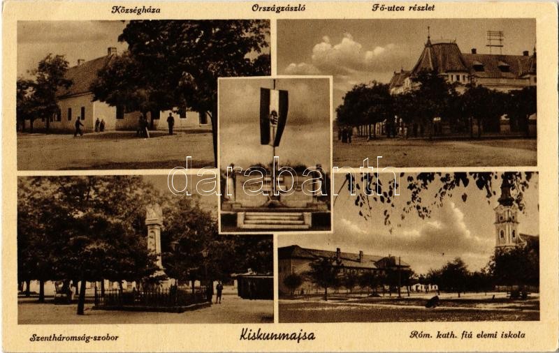 Kiskunmajsa, Községháza, Országzászló, Fő utca, Szentháromság szobor, Római katolikus fiú elemi iskola. Kiadja Bodor Zoltán
