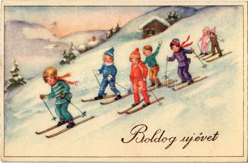 1939 Boldog Újévet! / Skiing children, winter sport, New Year greeting...