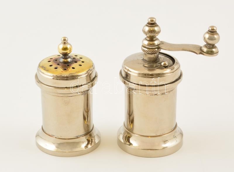 Ezüstözött alpakka sószóró és kis borsdaráló, m: 8 és 9 cm