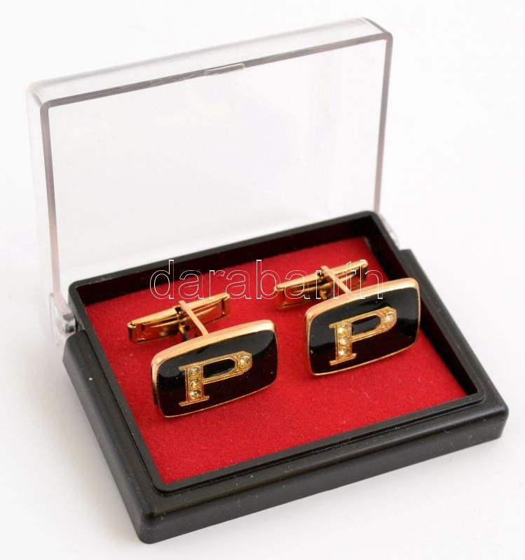 "P" betűs, kö berakásos mandzsettagomb pár, dobozban