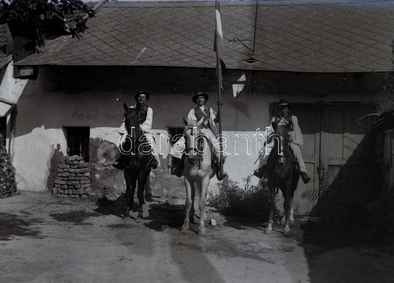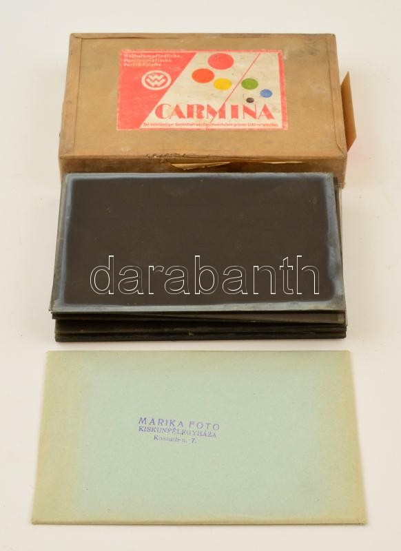 cca 1940-es években készült 17 db vintage üveglemez negatív, a kiskunfélegyházi Marika fotóműterem hagyatékából (Mosonyi Antalné felvételei), sokféle téma: kovácsmester háza előtt, gyors és gépíró iskola, viseletek, rokka, foci csapat, cigányzenészek, stb..., 9x12 cm és 10x15 cm