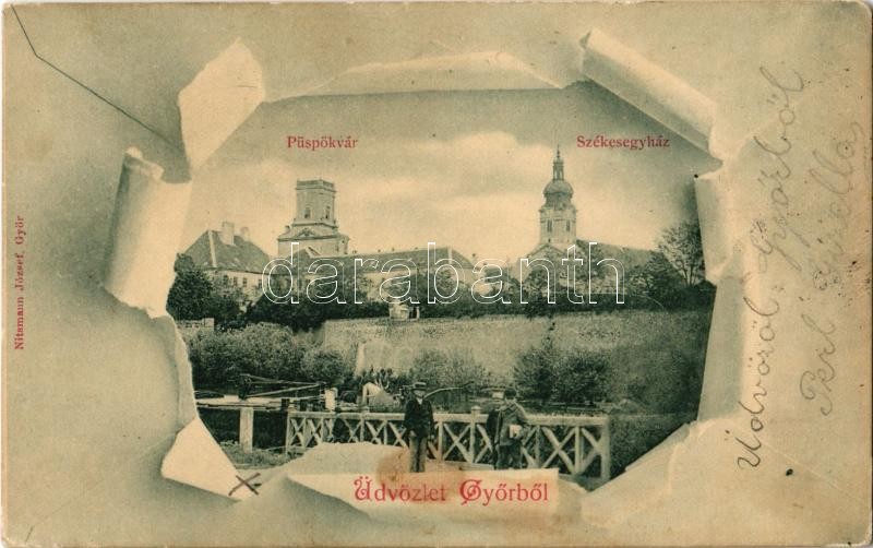 1900 Győr, Püspökvár, Székesegyház, folyópart és uszály. Nitsmann József kiadása, Art Nouveau
