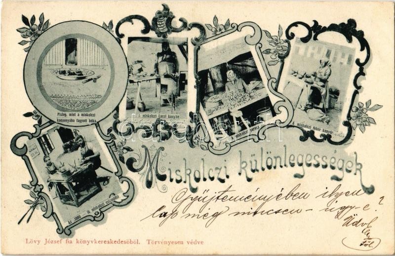 Description: 1901 Miskolc, Miskolczi különlegességek: "Pislog, mint a miskolczi kocsonyába fagyott béka", a miskolci Lacikonyha, miskolci perec, miskolci fehér kenyér, az 1000-ik miskolci csizmadia. Lövy József fia kiadása. Art Nouveau, floral