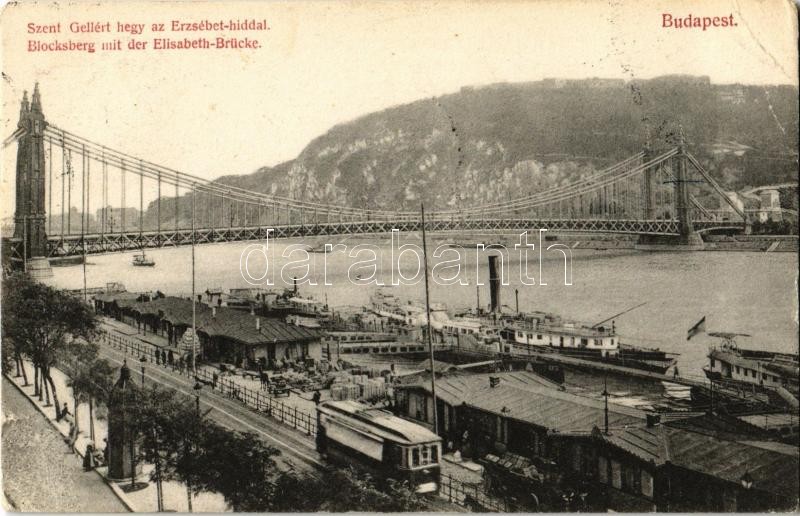 1907 Budapest V. Szent Gellért hegy az Erzsébet híddal, előtérben villamos, rakpart, gőzhajók (kis szakadás / small tear)