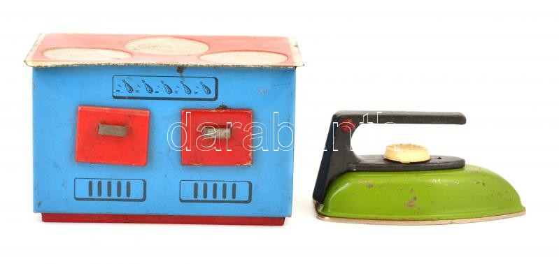 Régi lemez tűzhely, és vasaló, fém-műanyag, kopásnyomokkal, 9x14x8 cm ...