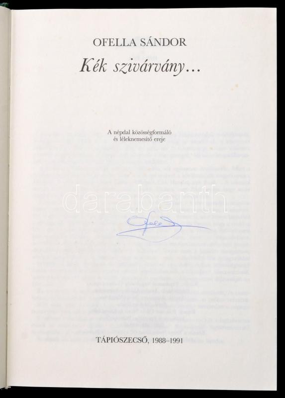 Ofella Sándor: Kék szivárvány. Aláírt! Tápiószecső, 1991. Tápiószecső Önkormányzata. Kiadói kartonálás.