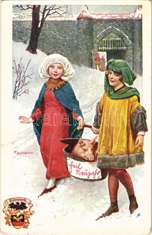 1912 New Year greeting card, girls with pig; Verlag des Vereines Südmark, Neujahrskarte Nr. 230 s: F. Schwarz (fl)
