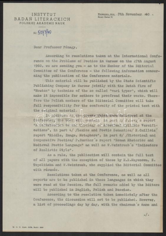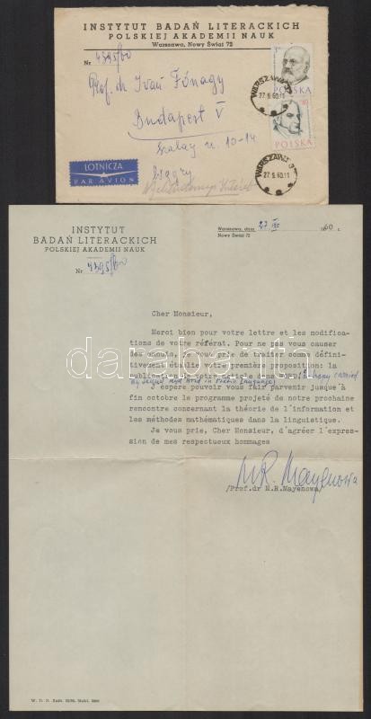 1960 Varsó, dr. Maria Renata Mayenowa (1908-1988) lengyel irodalomtudós két levele Fónagy Ivánhoz