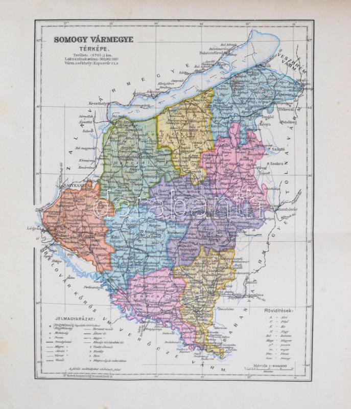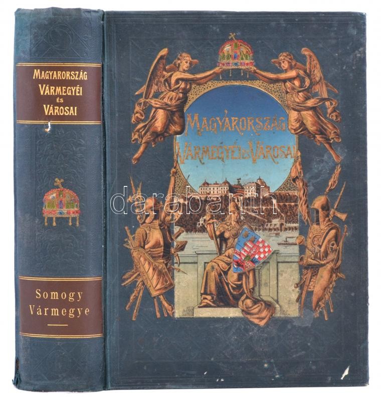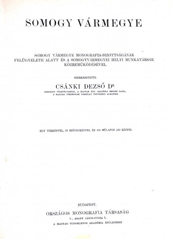 Somogy vármegye. Szerk.: Dr. Csánki Dezső. Magyarország vármegyéi és városai. Magyarország monográfiája. Bp.,(1914),Országos Monográfia Társaság,(Hornyánszky-ny.), 1 t.(térkép)+655 p. Kiadói aranyozott, festett, dombornyomásos egészvászon-kötésben, Gottermayer-kötés, festett lapélekkel, kopott, foltos borítóval, a könyvtest elvált a gerincétől, a gerincen kis sérüléssel, a hátsó kötéstábla sérült, de belül jó állapotban, a lapok fehérek, épek, hiánytalanok.