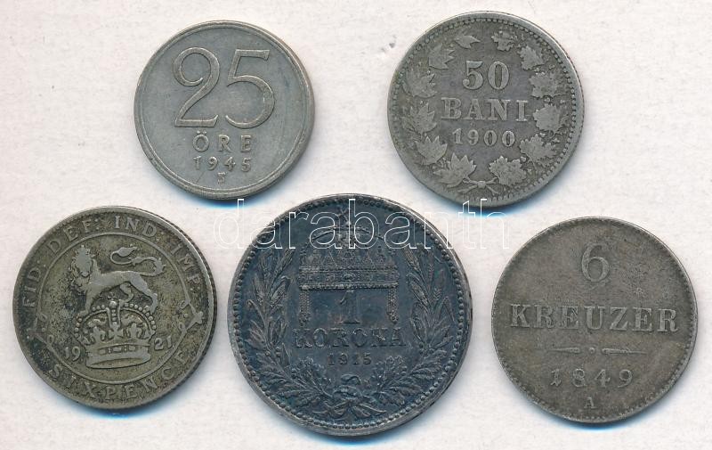 5db-os vegyes magyar és külföldi ezüstpénz tétel, közte Ausztria 1849A 6kr Ag; Románia 1900. 50b Ag T:2-3 patina
