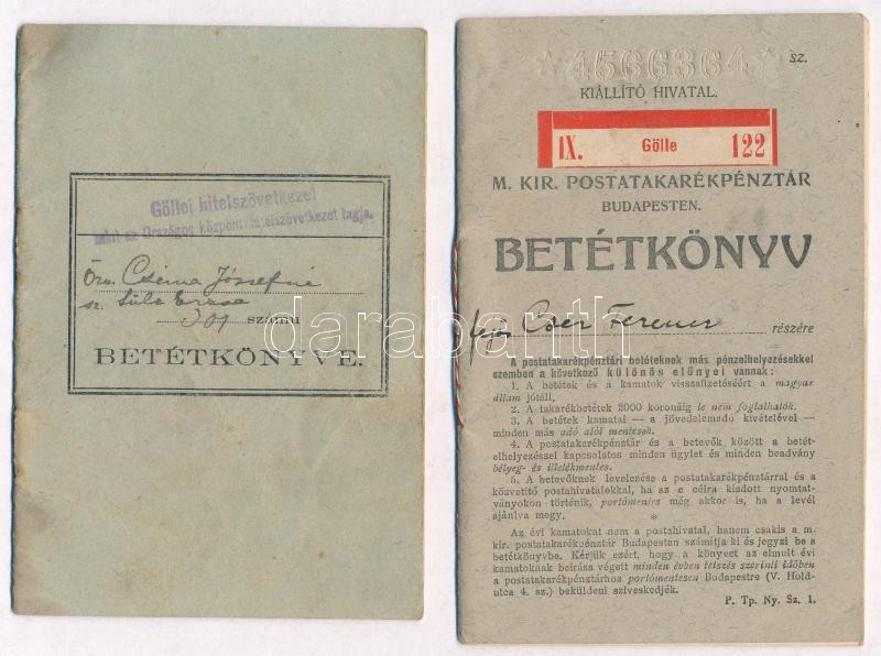 Description: ~1910-1917. "Göllei hitelszövetkezet mint az Országos központi hitelszövetkezet tagja" betétkönyve (2x) + 1921. "Gölle M. Kir. Postatakarékpénztár" betétkönyve