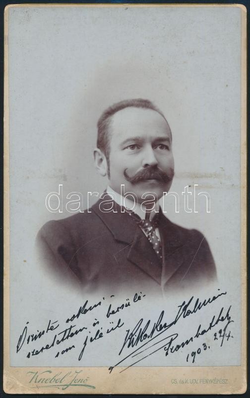 1903 Azonosítatlan férfi portréja, keményhátú fotó Knebel Jenő szombathelyi műterméből, üdvözlő sorokkal és aláírással, 21,5×13 cm
