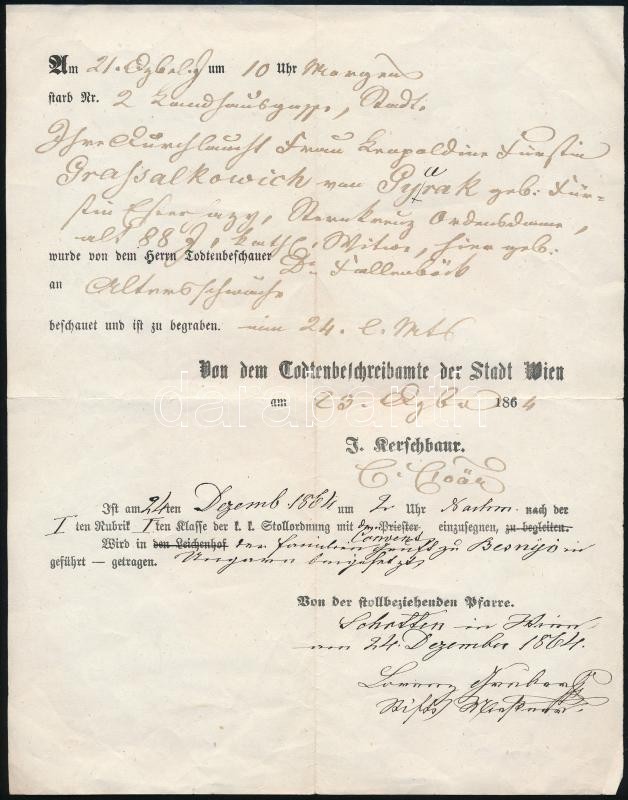 1864 Halotti bizonyítvány Grassalkovich névvel, Bécs városától