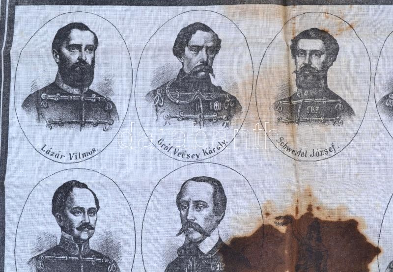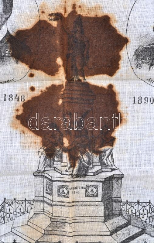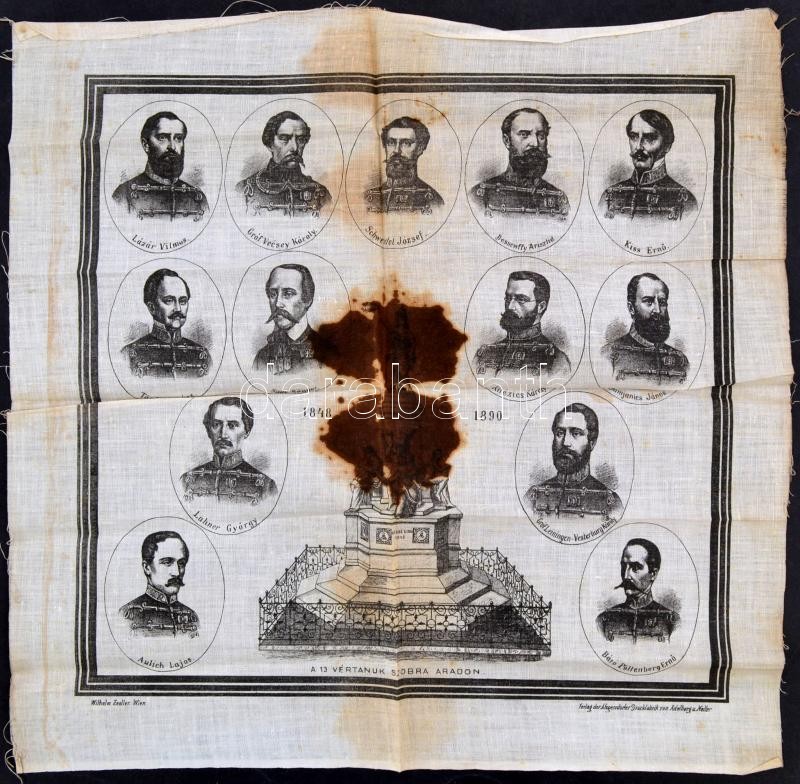 Description: 1890 Az Aradi Vértanúk emlékművének felállítása alkalmából kiadott vászon emlék kendő az 1848-49-es szabadságharc áldozatainak és az emlékmű képével, foltos 38x39 cm